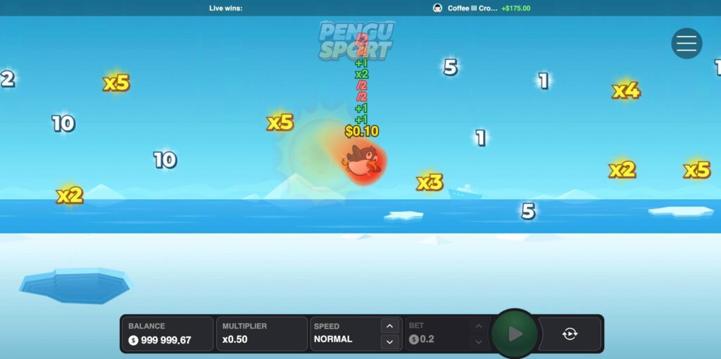 Pengu sport play is built around a simple sequence that is easy to learn and quick to repeat. You choose your stake, set the preferred speed, launch the penguin, and watch the flight develop as the multiplier increases. The official description emphasizes the combination of timing, distance, momentum, and larger rewards as the character flies through the icy landscape.